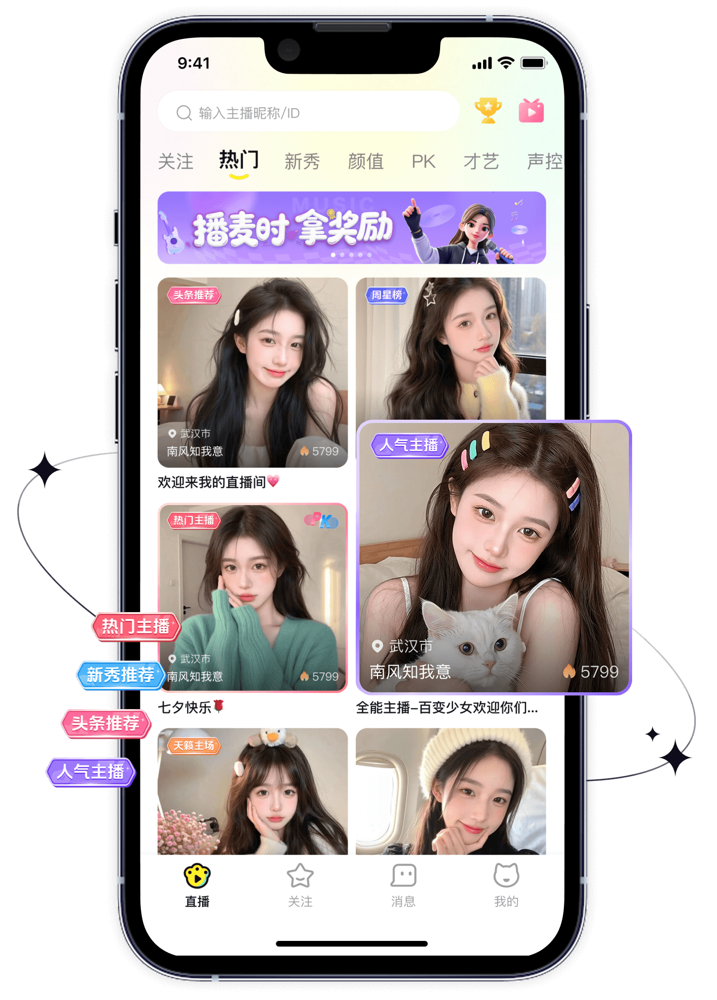 首页为app核心功能,在主页能够找到自己感兴趣的才艺主播,当然用户也可以通过搜索进行主播的寻找,卡片式布局清晰简洁,可以很好的满足用户线上交友需求,也更高同步度和强互动性,实现社交交友效率的大幅提升。